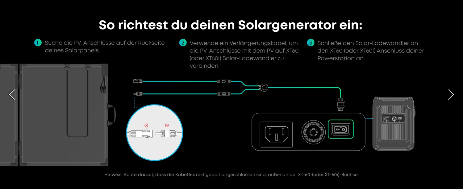 Via XT60i: C2000 Gen 2, C1000 Gen 2, C1000X, F3000. 2× PS400 parallel = 800 W. Passende Adapter und Kabel finden Sie im Shop.
