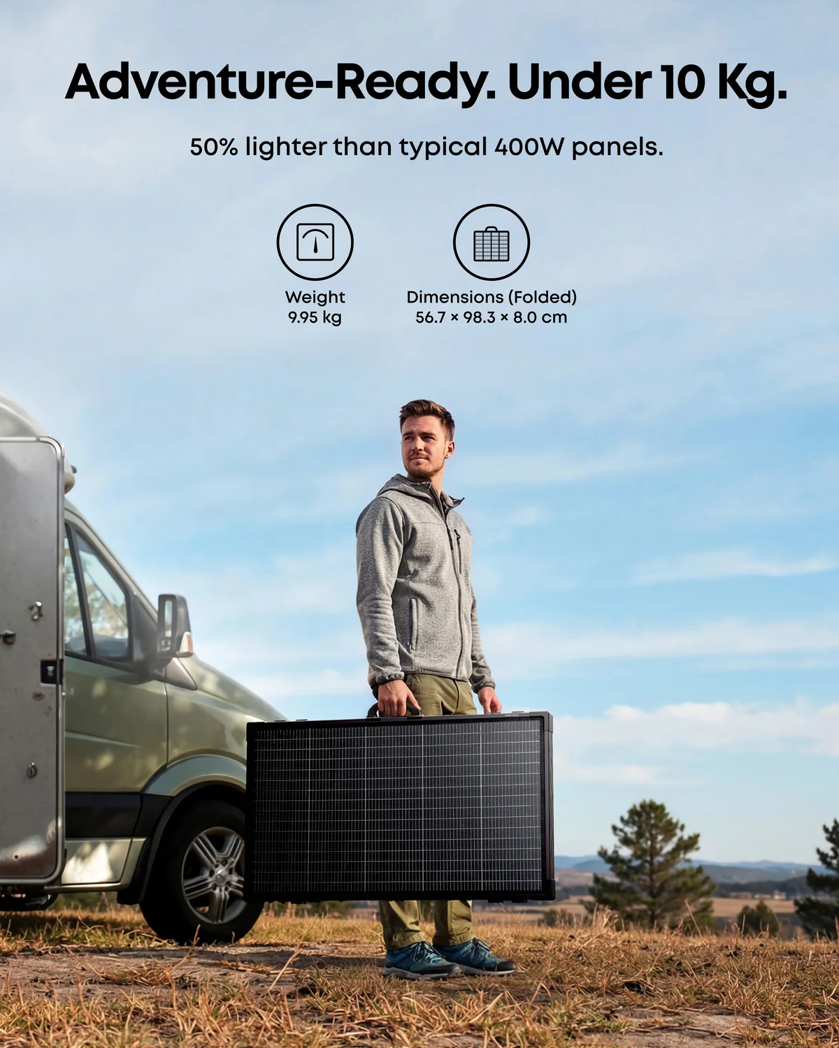 Das Anker SOLIX PS400 ist das leistungsstärkste tragbare Solarpanel der PS-Serie. Mit 400 W Nennleistung und bis zu 440 W effektiver Leistung durch bifaziale Energiegewinnung lädt es die Anker SOLIX C2000 Gen 2 Powerstation in nur rund 3 Stunden komplett per Sonne. Fortschrittliche N-Typ monokristalline Solarzellen erreichen über 25 % Wirkungsgrad. IP68-Wasserschutz und ein verstärkter Aluminiumrahmen machen das PS400 zum idealen Solarpanel für anspruchsvolle Camping-Touren, Wohnmobil-Reisen und professionelle Off-Grid-Anwendungen. Trotz der hohen Leistung wiegt das PS400 nur 9,9 kg – über 50 % leichter als herkömmliche 400-Watt-Panels.